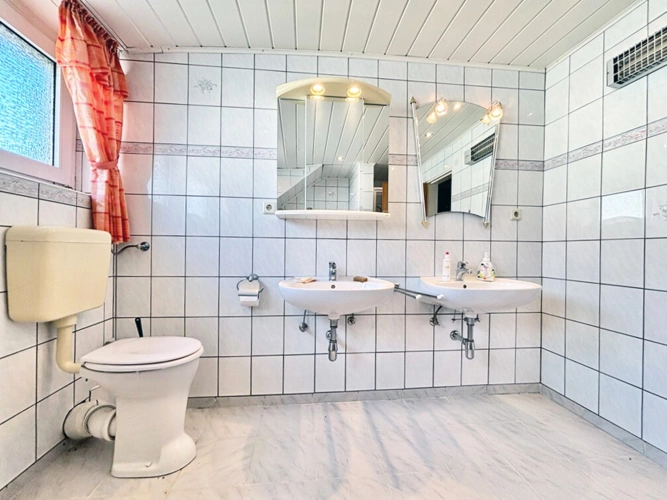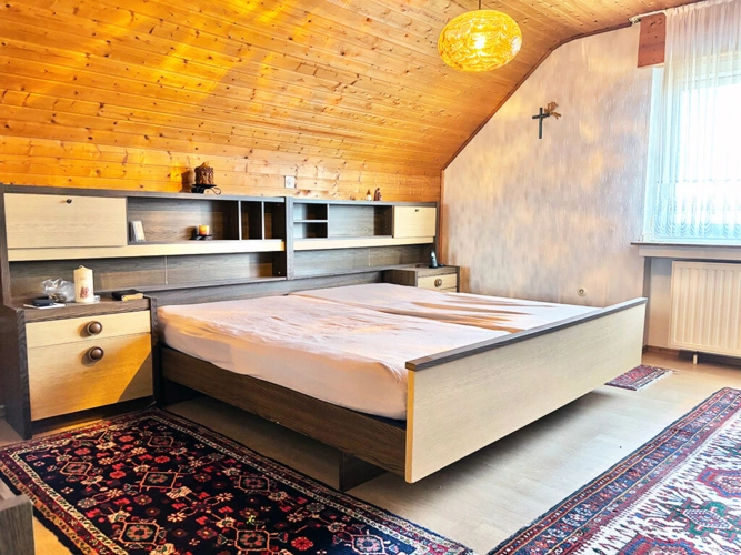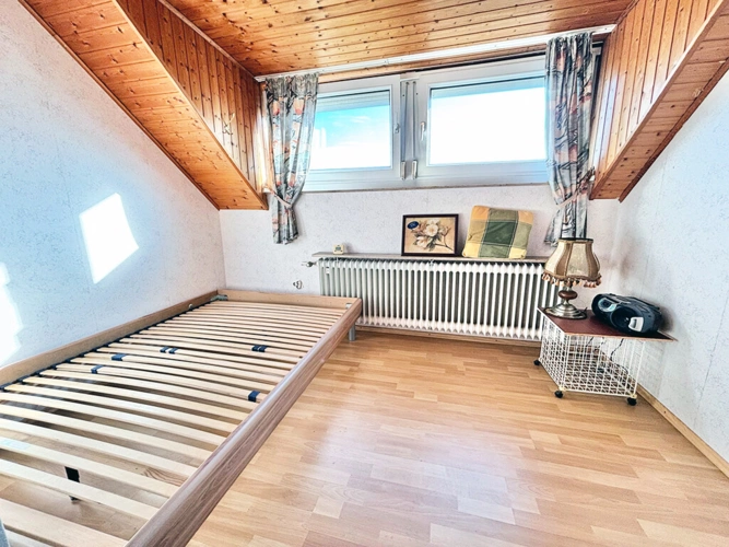 Dachgeschoss: Elternschlafzimmer, Kinderzimmer I, Kinderzimmer II (respektive Büro), Flur (mit Zugang zum Boden), Bad (mit Wanne und Dusche), Abstellraum