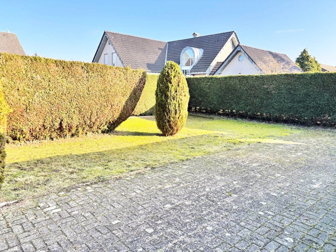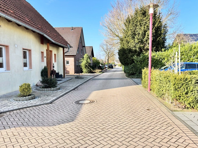 Die Zufahrt für das dahinter liegen Haus führt entlang der linken Grundstücksgrenze und ist in der Breite von drei Metern über ein eingetragenes Wegerecht für den Nachbarn gesichert.