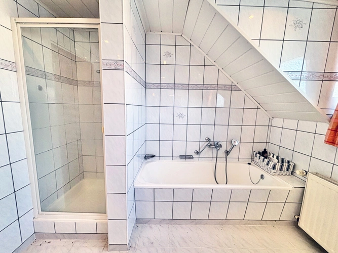 Erdgeschoss: Wohnzimmer, Schlafzimmer, Küche, Flur, Bad (mit Wanne und Dusche)
