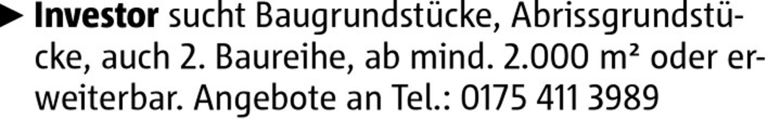Investor sucht Baugrundstücke, Abrissgrundstücke, auch 2. Baureihe, ab mind. 2.000 m² oder erweiterbar. Angebote an Tel.: 0175 411 3989
