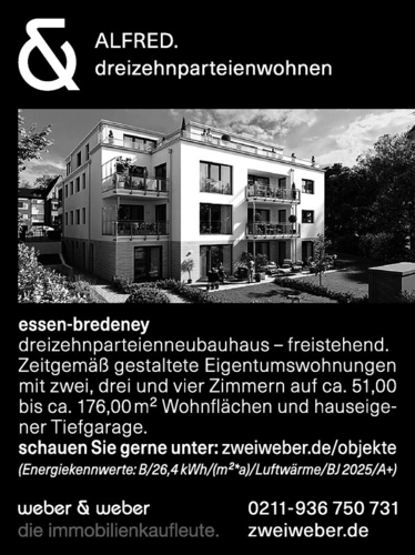 Essen-Bredeney. Dreizehnperteienneubauhaus - freistehend. Zeitgemäß gestaltete Eigentumswohnungen mit zwei, drei und vier Zimmern auf ca. 51,00 bis ca. 176,00 m² Wohnflächen und hauseigener Tiefgarage. Schauen Sie gerne unter: zweiweber.de/objekte (Energiekennwerte: B/26,4 kWh/(m²*a)/Luftwärme/BJ2025/A+) weber&weber die Immobilienkaufleute, 0211-936 750 731, zweiweber.de