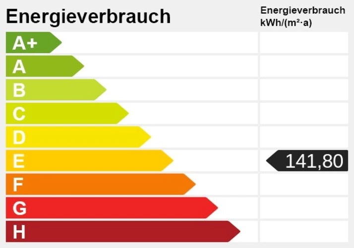 Es liegt ein Energieverbrauchsausweis vor. Dieser ist gültig bis 23.7.2028. Endenergieverbrauch beträgt 141.80 kwh/(m²*a). Wesentlicher Energieträger der Heizung ist Gas. Das Baujahr des Objekts lt. Energieausweis ist 1977. Die Energieeffizienzklasse ist E.