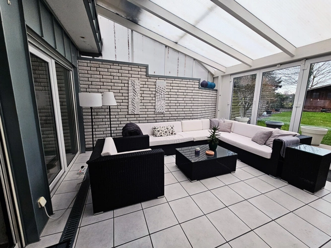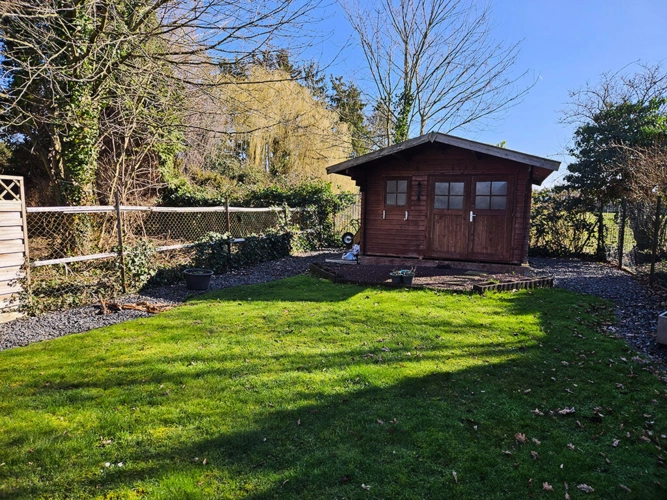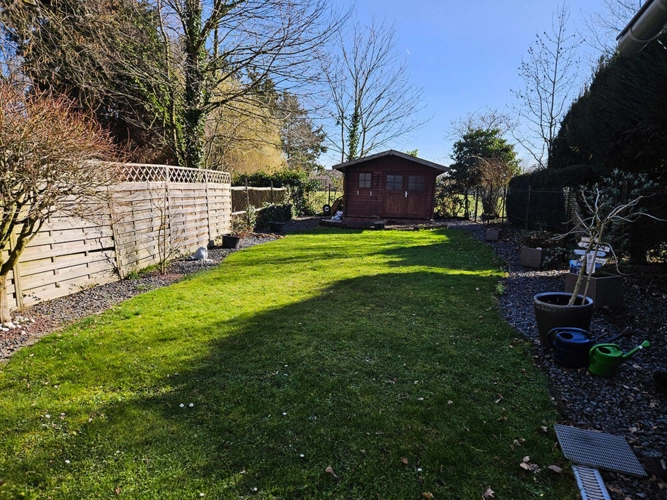 Im Außenbereich stehen eine überdachte Terrasse sowie ein Gartenhaus zur Verfügung.
