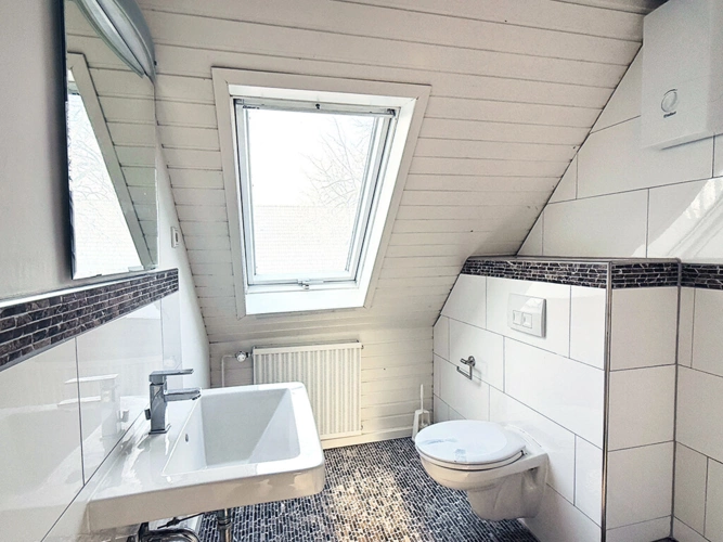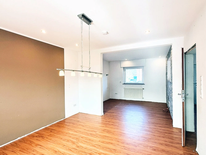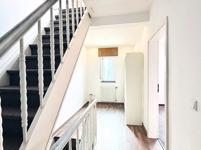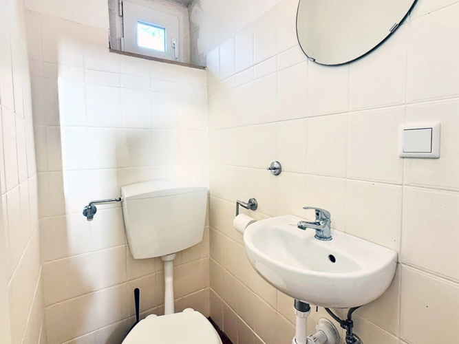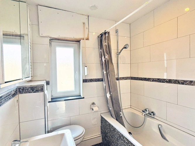 Im Obergeschoss stehen zwei Schlafzimmer sowie ein Tageslichtbad mit Wanne, WC und Waschbecken zur Verfügung. Die Warmwasseraufbereitung erfolgt über einen Durchlauferhitzer. Der geräumige Flur eignet sich ideal als zusätzliche Stellfläche oder als Arbeitsbereich.