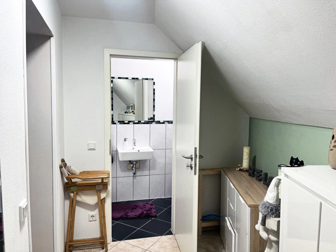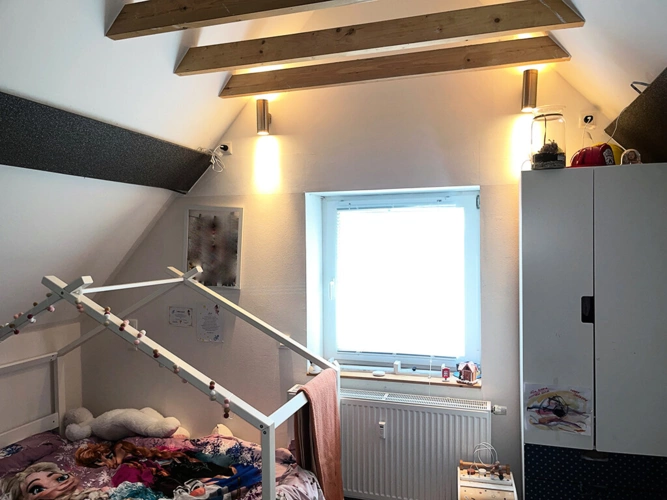 Dachgeschoss: Wohnung (ca. 104 m²): Wohn- und Esszimmer mit offener Küche und Balkonzugang, Schlafzimmer, Kinderzimmer, Büro, Flur, Bad (mit Dusche), Gäste-WC, Hauswirtschaftsraum