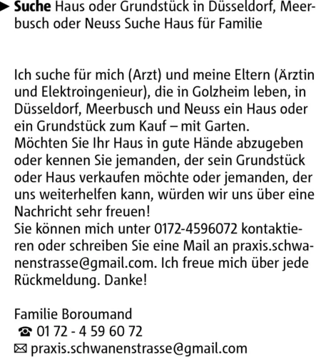 Suche Haus oder Grundstück in Düsseldorf, Meerbusch oder Neuss Suche Haus für Familie Ich suche für mich (Arzt) und meine Eltern (Ärztin und Elektroingenieur), die in Golzheim leben, in Düsseldorf, Meerbusch und Neuss ein Haus oder ein Grundstück zum Kauf mit Garten. Möchten Sie Ihr Haus in gute Hände abzugeben oder kennen Sie jemanden, der sein Grundstück oder Haus verkaufen möchte oder jemanden, der uns weiterhelfen kann, würden wir uns über eine Nachricht sehr freuen! Sie können mich unter 0172-4596072 kontaktieren oder schreiben Sie eine Mail an praxis.schwanenstrasse@gmail.com. Ich freue mich über jede Rückmeldung. Danke! Familie Boroumand 01 72 - 4 59 60 72 praxis.schwanenstrasse@gmail.com