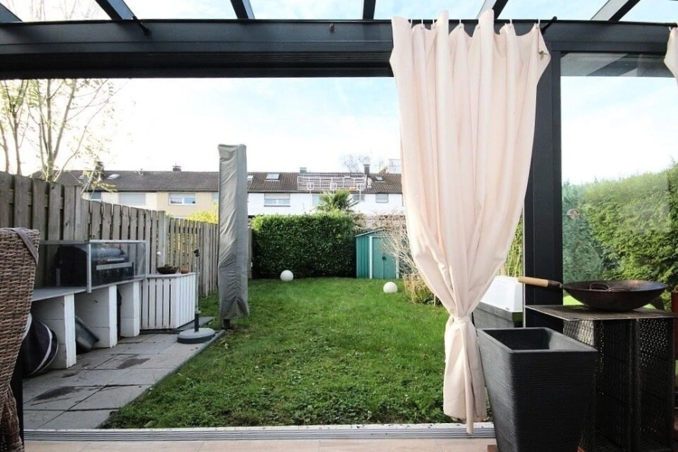 Vom Esszimmer haben Sie einen fantastischen Blick und Zugang zur Terrasse. Diese ist überdacht und mit Glaselementen geschlossen. Hier sitzen Sie geschützt und können den Blick in den Garten auch bei einem Regenschauer genießen. Da es sich um keinen Wintergarten handelt, liegt uns keine Genehmigung vor. Das Grundstück ist so ausgerichtet, dass Sie die Sonne am Nachmittag und in den Abendstunden genießen können.