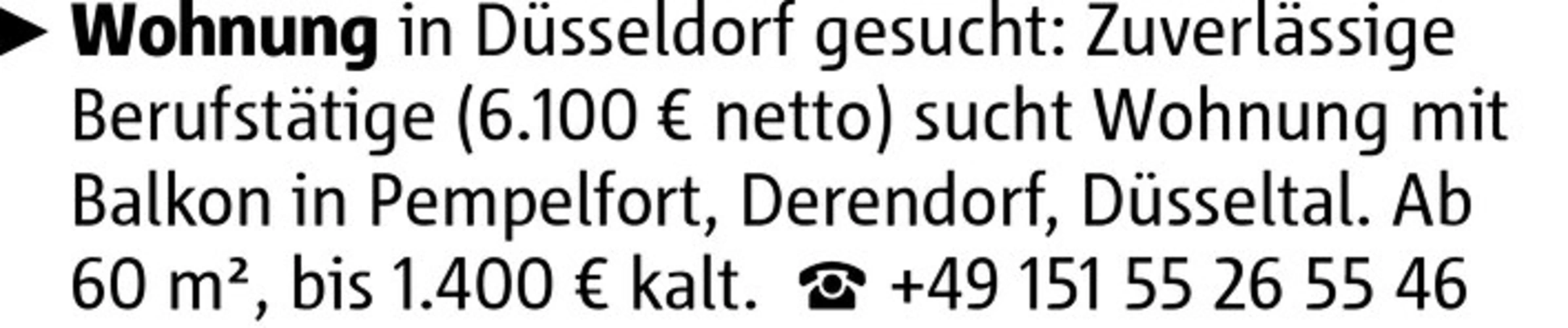 Wohnung in Düsseldorf gesucht: Zuverlässige Berufstätige (6.100 € netto) sucht Wohnung mit Balkon in Pempelfort, Derendorf, Düsseltal. Ab 60 m², bis 1.400 € kalt. +49 151 55 26 55 46