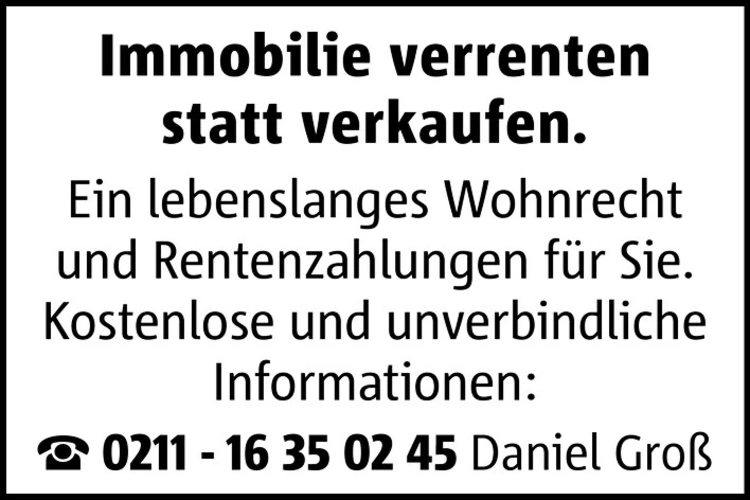 Immobilie verrenten statt verkaufen. Ein lebenslanges Wohnrecht und Rentenzahlungen für Sie. Kostenlose und unverbindliche Informationen: 0211 - 16 35 02 45 Daniel Groß