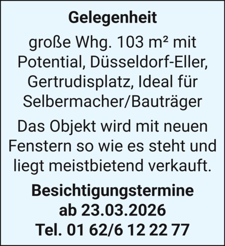 Gelegenheit große Whg. 103 m² mit Potential, Düsseldorf-Eller, Gertrudisplatz, Ideal für Selbermacher/Bauträger. Das Objekt wird mit neuen Fenstern so wie es steht und liegt meistbietend verkauft. Besichtigungstermine ab 23.03.2026 Tel. 01 62/6 12 22 77