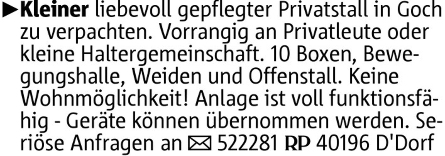 Kleiner liebevoll gepflegter Privatstall in Goch zu verpachten. Vorrangig an Privatleute oder kleine Haltergemeinschaft. 10 Boxen, Bewegungshalle, Weiden und Offenstall. Keine Wohnmöglichkeit! Anlage ist voll funktionsfähig - Geräte können übernommen werden. Seriöse Anfragen an 522281 40196 D'Dorf