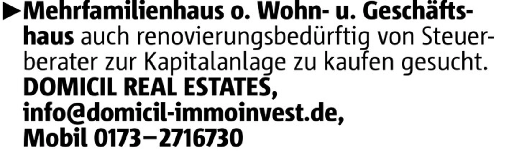 Mehrfamilienhaus o. Wohn- u. Geschäftshaus auch renovierungsbedürftig von Steuerberater zur Kapitalanlage zu kaufen gesucht. DOMICIL REAL ESTATES, info@domicil-immoinvest.de, Mobil 0173-2716730