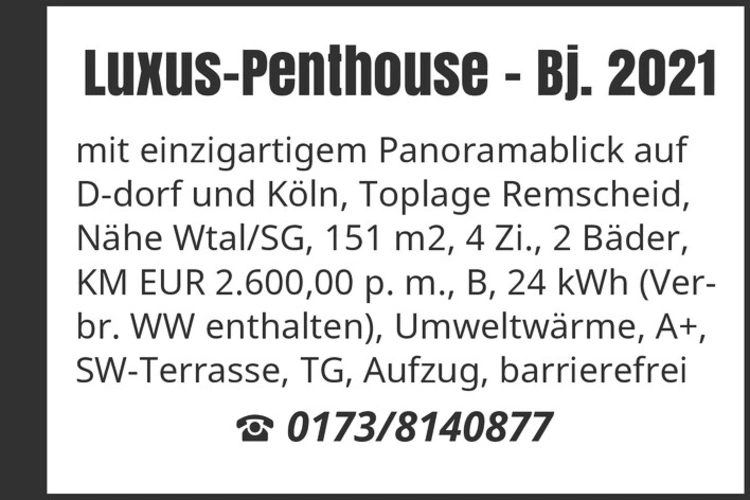 Luxus-Penthouse - Bj. 2021 mit einzigartigem Panoramablick auf D-dorf und Köln, Toplage Remscheid, Nähe Wtal/SG, 151 m², 4 Zi., 2 Bäder, KM EUR 2.600,00 p. m., B, 24 kWh (Verbr. WW enthalten), Umweltwärme, A+, SW-Terrasse, TG, Aufzug, barrierefrei 0173/8140877