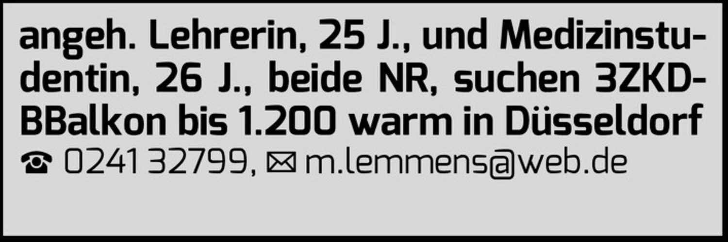 Angeh. Lehrerin, 25 J., und Medizinstudentin, 26 J., beide NR, suchen 3ZKDB mit Balkon bis 1.200 warm in Düsseldorf 0241 32799, m.lemmens@web.de
