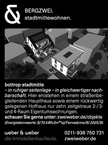 Bergzwei. Stadtmittewohnen. Bottrop-Stadtmitte. In ruhiger Seitenlage - In gleichwertiger nach - Barschaft. Hier entstehen in einem straßenbegleitenden Haupthaus sowie einem rückwertig gelegenen Hofhaus nur zehn zeitgetreue 2-/ 3- und 4-Raum Eigentumswohnungen. Schauen Sie gerne unter: zweiweber.de/objekte (Energiekennwerte: B/70 kWh/(m²*a)/Fernwärme/BJ 2025/B). weber&weber Die Immobilienkaufleute. 0211-936 750 731 zweiweber.de