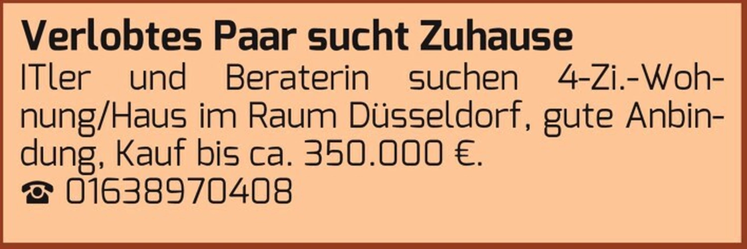 Verlobtes Paar sucht Zuhause IT-ler und Beraterin suchen 4-Zi.-Wohnung/Haus im Raum Düsseldorf, gute Anbindung, Kauf bis ca. 350.000 €. 01638970408