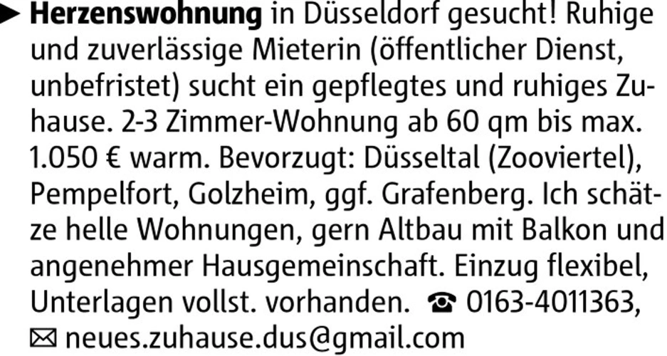 Herzenswohnung in Düsseldorf gesucht! Ruhige und zuverlässige Mieterin (öffentlicher Dienst, unbefristet) sucht ein gepflegtes und ruhiges Zuhause. 2-3 Zimmer-Wohnung ab 60 qm bis max. 1.050 € warm. Bevorzugt: Düsseltal (Zooviertel), Pempelfort, Golzheim, ggf. Grafenberg. Ich schätze helle Wohnungen, gern Altbau mit Balkon und angenehmer Hausgemeinschaft. Einzug flexibel, Unterlagen vollst. vorhanden. 0163-4011363, neues.zuhause.dus@gmail.com
