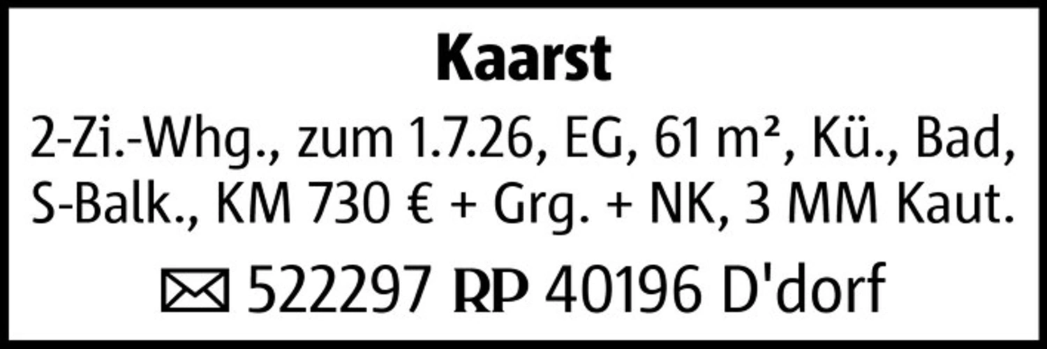 Kaarst 2-Zi.-Whg., zum 1.7.26, EG, 61 m², Kü., Bad, S-Balk., KM 730 € + Grg. + NK, 3 MM Kaut. 522297 40196 D'dorf
