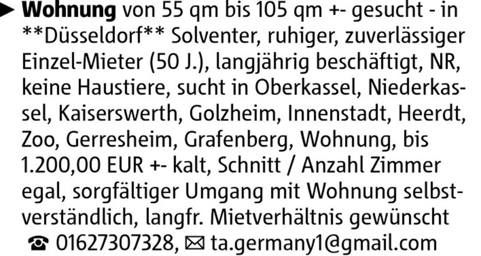Wohnung von 55 qm bis 105 qm +- gesucht - in Düsseldorf Solventer, ruhiger, zuverlässiger Einzel-Mieter (50 J.), langjährig beschäftigt, NR, keine Haustiere, sucht in Oberkassel, Niederkassel, Kaiserswerth, Golzheim, Innenstadt, Heerdt, Zoo, Gerresheim, Grafenberg, Wohnung, bis 1.200,00 EUR +- kalt, Schnitt / Anzahl Zimmer egal, sorgfältiger Umgang mit Wohnung selbstverständlich, langfr. Mietverhältnis gewünscht 01627307328, ta.germany1@gmail.com