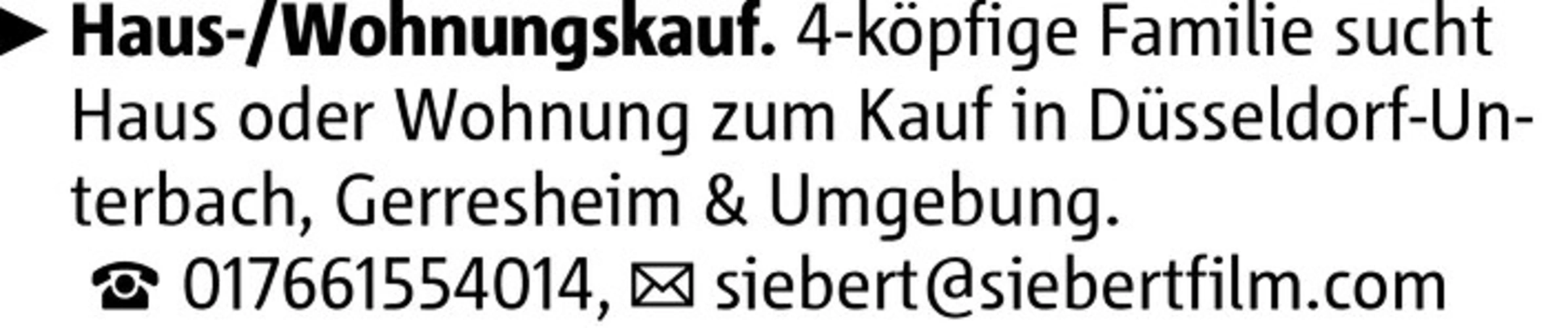 Haus-/Wohnungskauf. 4-köpfige Familie sucht Haus oder Wohnung zum Kauf in Düsseldorf-Unterbach, Gerresheim & Umgebung. 017661554014, siebert@siebertfilm.com