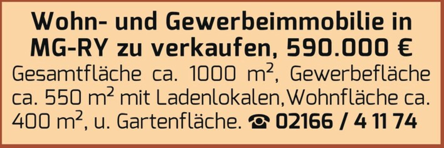 Wohn- und Gewerbeimmobilie in MG-RY zu verkaufen, 590.000 € Gesamtfläche ca. 1000 m², Gewerbefläche ca. 550 m² mit Ladenlokalen, Wohnfläche ca. 400 m², u. Gartenfläche. 02166 / 4 11 74