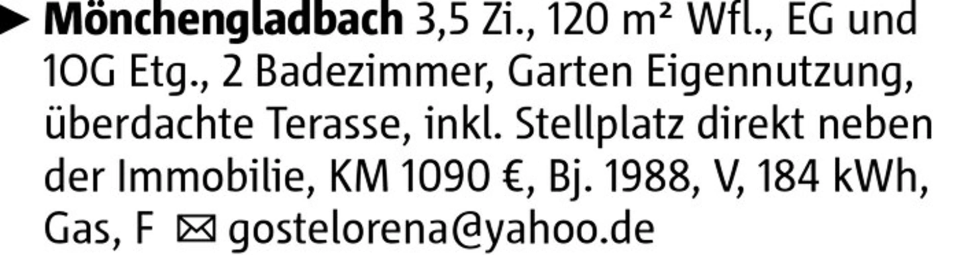 Mönchengladbach 3,5 Zi., 120 m² Wfl., EG und 1OG Etg., 2 Badezimmer, Garten Eigennutzung, überdachte Terasse, inkl. Stellplatz direkt neben der Immobilie, KM 1090 €, Bj. 1988, V, 184 kWh, Gas, F gostelorena@yahoo.de