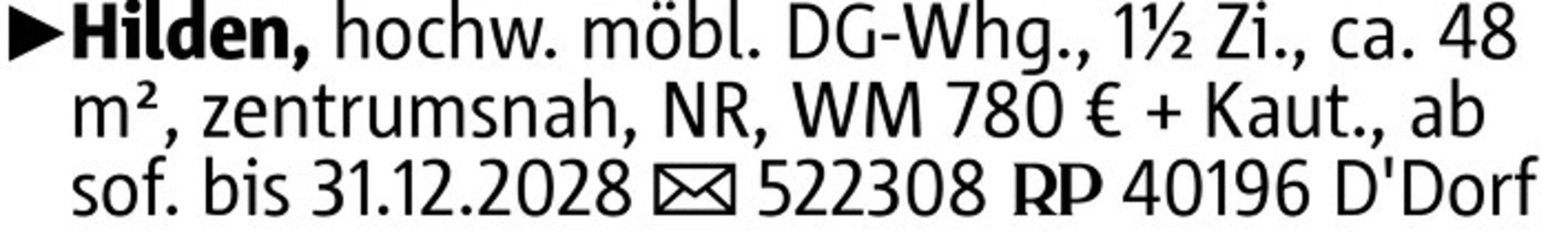 Hilden, hochw. möbl. DG-Whg., 1½ Zi., ca. 48 m², zentrumsnah, NR, WM 780 € + Kaut., ab sof. bis 31.12.2028, 522308 40196 D'Dorf