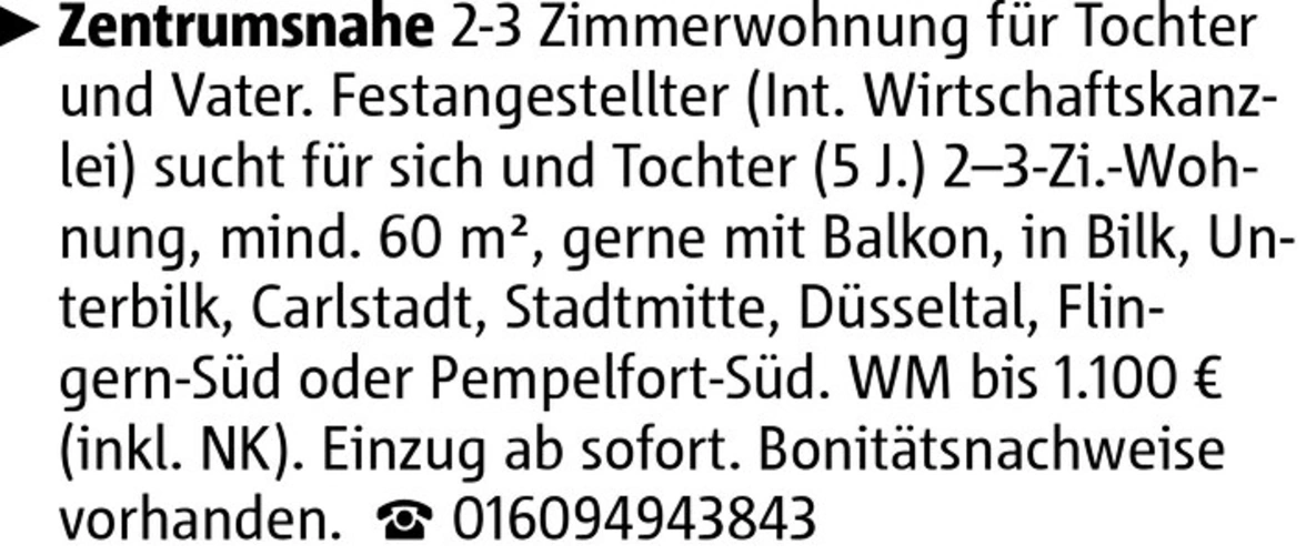 Zentrumsnahe 2-3 Zimmerwohnung für Tochter und Vater. Festangestellter (Int. Wirtschaftskanzlei) sucht für sich und Tochter (5 J.) 2-3-Zi.-Wohnung, mind. 60 m², gerne mit Balkon, in Bilk, Unterbilk, Carlstadt, Stadtmitte, Düsseltal, Flingern-Süd oder Pempelfort-Süd. WM bis 1.100 € (inkl. NK). Einzug ab sofort. Bonitätsnachweise vorhanden. 016094943843