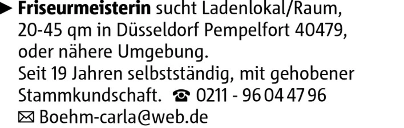 Friseurmeisterin sucht Ladenlokal/Raum, 20-45 qm in Düsseldorf Pempelfort 40479, oder nähere Umgebung. Seit 19 Jahren selbstständig, mit gehobener Stammkundschaft. 0211 - 96 04 47 96 Boehm-carla@web.de