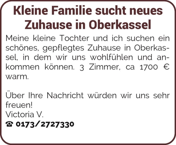 Kleine Familie sucht neues Zuhause in Oberkassel Meine kleine Tochter und ich suchen ein schönes, gepflegtes Zuhause in Oberkassel, in dem wir uns wohlfühlen und ankommen können. 3 Zimmer, ca 1700 € warm. Über Ihre Nachricht würden wir uns sehr freuen! Victoria V. 0173/2727330