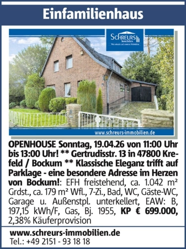 Einfamilienhaus OPENHOUSE Sonntag, 19.04.26 von 11:00 Uhr bis 13:00 Uhr! ** Gertrudisstr. 13 in 47800 Krefeld / Bockum ** Klassische Eleganz trifft auf Parklage - eine besondere Adresse im Herzen von Bockum!: EFH freistehend, ca. 1.042 m² Grdst., ca. 179 m² Wfl., 7-Zi., Bad, WC, Gäste-WC, Garage u. Außenstpl. unterkellert, EAW: B, 197,15 kWh/F, Gas, Bj. 1955, KP € 699.000, 2,38% Käuferprovision www.schreurs-immobilien.de Tel.: +49 2151 - 93 18 18