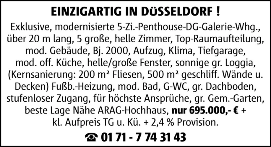 EINZIGARTIG IN DÜSSELDORF ! Exklusive, modernisierte 5-Zi.-Penthouse-DG-Galerie-Whg., über 20 m lang, 5 große, helle Zimmer, Top-Raumaufteilung, mod. Gebäude, Bj. 2000, Aufzug, Klima, Tiefgarage, mod. off. Küche, helle/große Fenster, sonnige gr. Loggia, (Kernsanierung: 200 m² Fliesen, 500 m² geschliff. Wände u. Decken) Fußb.-Heizung, mod. Bad, G-WC, gr. Dachboden, stufenloser Zugang, für höchste Ansprüche, gr. Gem.-Garten, beste Lage Nähe ARAG-Hochhaus, nur 695.000,- € + kl. Aufpreis TG u. Kü. + 2,4 % Provision. 01 71 - 7 74 31 43