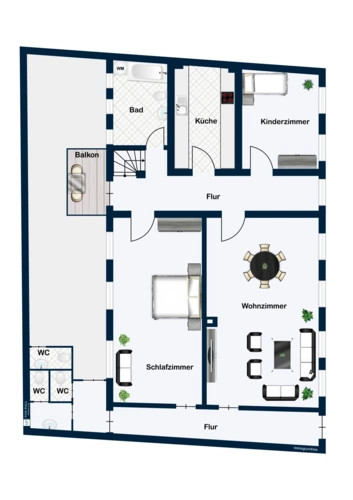 Die Wohnung im Obergeschoss mit ca. 100 m² verfügt über eine großzügige Diele, einem Wohnraum sowie zwei Schlafräumen, einer gut geschnittenen Küche und einem Tageslicht-Badezimmer.