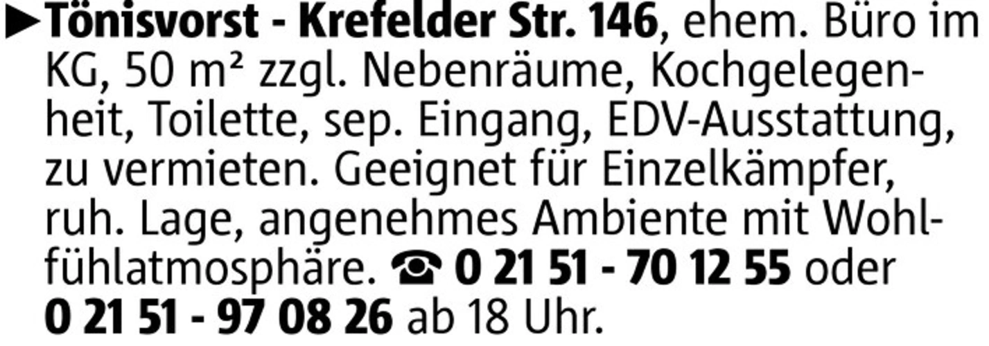 Tönisvorst - Krefelder Str. 146, ehem. Büro im KG, 50 m² zzgl. Nebenräume, Kochgelegenheit, Toilette, sep. Eingang, EDV-Ausstattung, zu vermieten. Geeignet für Einzelkämpfer, ruh. Lage, angenehmes Ambiente mit Wohlfühlatmosphäre. 0 21 51 - 70 12 55 oder 0 21 51 - 97 08 26 ab 18 Uhr.