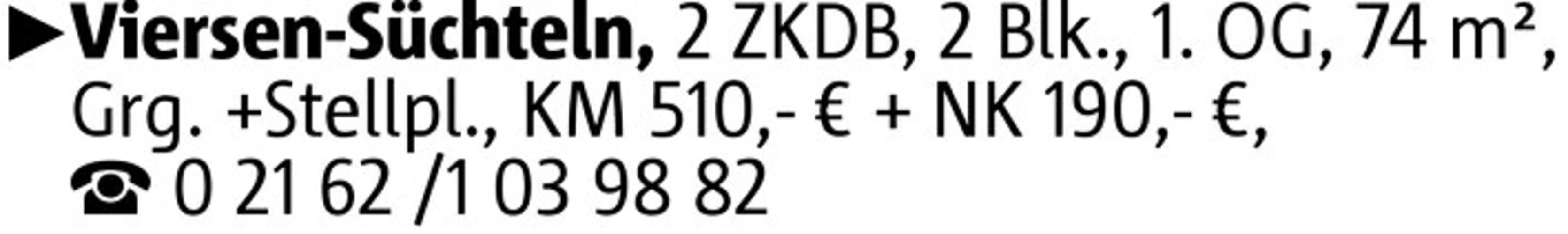 Viersen-Süchteln, 2 ZKDB, 2 Blk., 1. OG, 74 m², Grg.+Stellpl., KM 510,- € + NK 190,- €, 0 21 62 /1 03 98 82