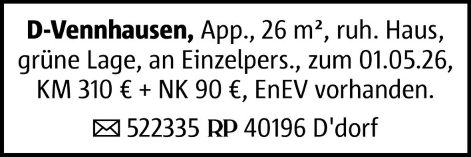 D-Vennhausen, App., 26 m², ruh. Haus, grüne Lage, an Einzelpers., zum 01.05.26, KM 310 € + NK 90 €, EnEV vorhanden. 522335 40196 D'dorf