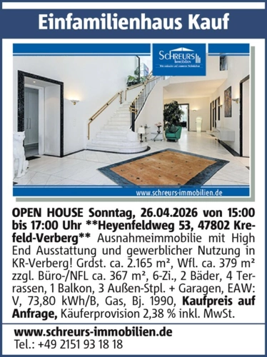 Einfamilienhaus Kauf OPEN HOUSE Sonntag, 26.04.2026 von 15:00 bis 17:00 Uhr Heyenfeldweg 53, 47802 Krefeld-Verberg Ausnahmeimmobilie mit High End Ausstattung und gewerblicher Nutzung in KR-Verberg! Grdst. ca. 2.165 m², Wfl. ca. 379 m² zzgl. Büro-/NFL ca. 367 m², 6-Zi., 2 Bäder, 4 Terrassen, 1 Balkon, 3 Außen-Stpl. + Garagen, EAW: V, 73,80 kWh/B, Gas, Bj. 1990, Kaufpreis auf Anfrage, Käuferprovision 2,38 % inkl. MwSt. www.schreurs-immobilien.de Tel.: +49 2151 93 18 18