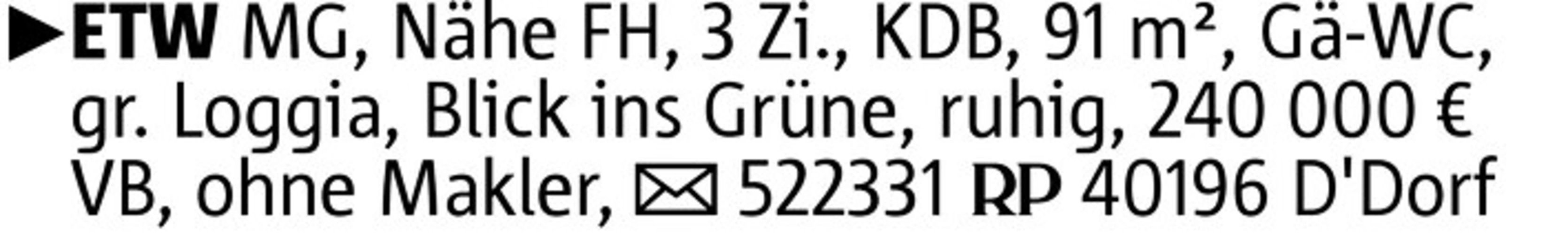 ETW MG, Nähe FH, 3 Zi., KDB, 91 m², Gä-WC, gr. Loggia, Blick ins Grüne, ruhig, 240 000 € VB, ohne Makler, 522331 40196 D'Dorf