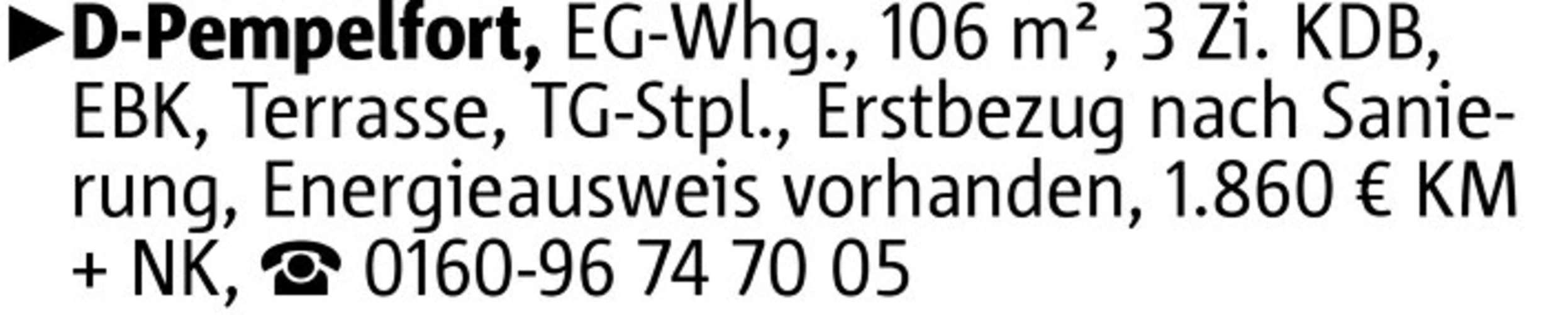 D-Pempelfort, EG-Whg., 106 m², 3 Zi. KDB, EBK, Terrasse, TG-Stpl., Erstbezug nach Sanierung, Energieausweis vorhanden, 1.860 € KM + NK, 0160-96 74 70 05
