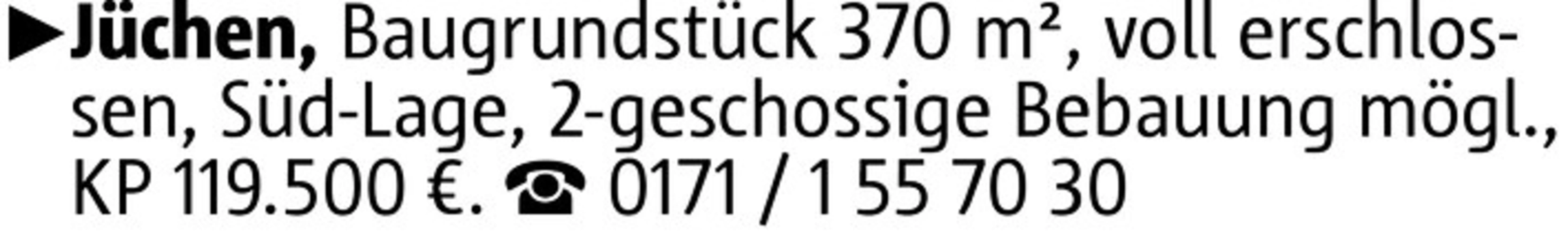 Jüchen, Baugrundstück 370 m², voll erschlossen, Süd-Lage, 2-geschossige Bebauung mögl., KP 119.500 €. 0171 / 1 55 70 30