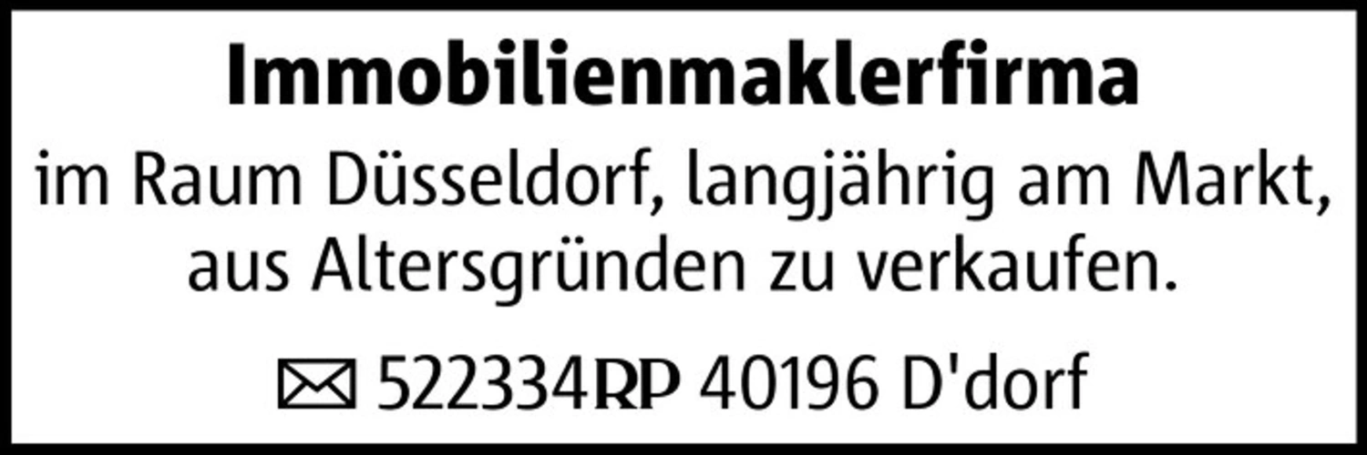 Immobilienmaklerfirma im Raum Düsseldorf, langjährig am Markt, aus Altersgründen zu verkaufen. 522334 40196 D'dorf