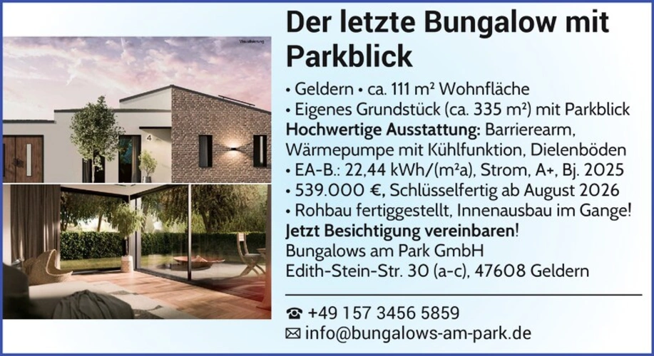 Der letzte Bungalow mit Parkblick Geldern ca. 111 m² Wohnfläche. Eigenes Grundstück (ca. 335 m²) mit Parkblick. Hochwertige Ausstattung: Barrierearm, Wärmepumpe mit Kühlfunktion, Dielenböden EA-B.: 22,44 kWh/(m²a), Strom, A+, Bj. 2025, 539.000 €, Schlüsselfertig ab August 2026 Rohbau fertiggestellt, Innenausbau im Gange! Jetzt Besichtigung vereinbaren! Bungalows am Park GmbH Edith-Stein-Str. 30 (a-c), 47608 Geldern +49 157 3456 5859 info@bungalows-am-park.de